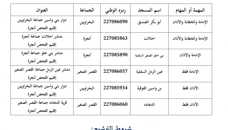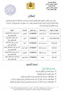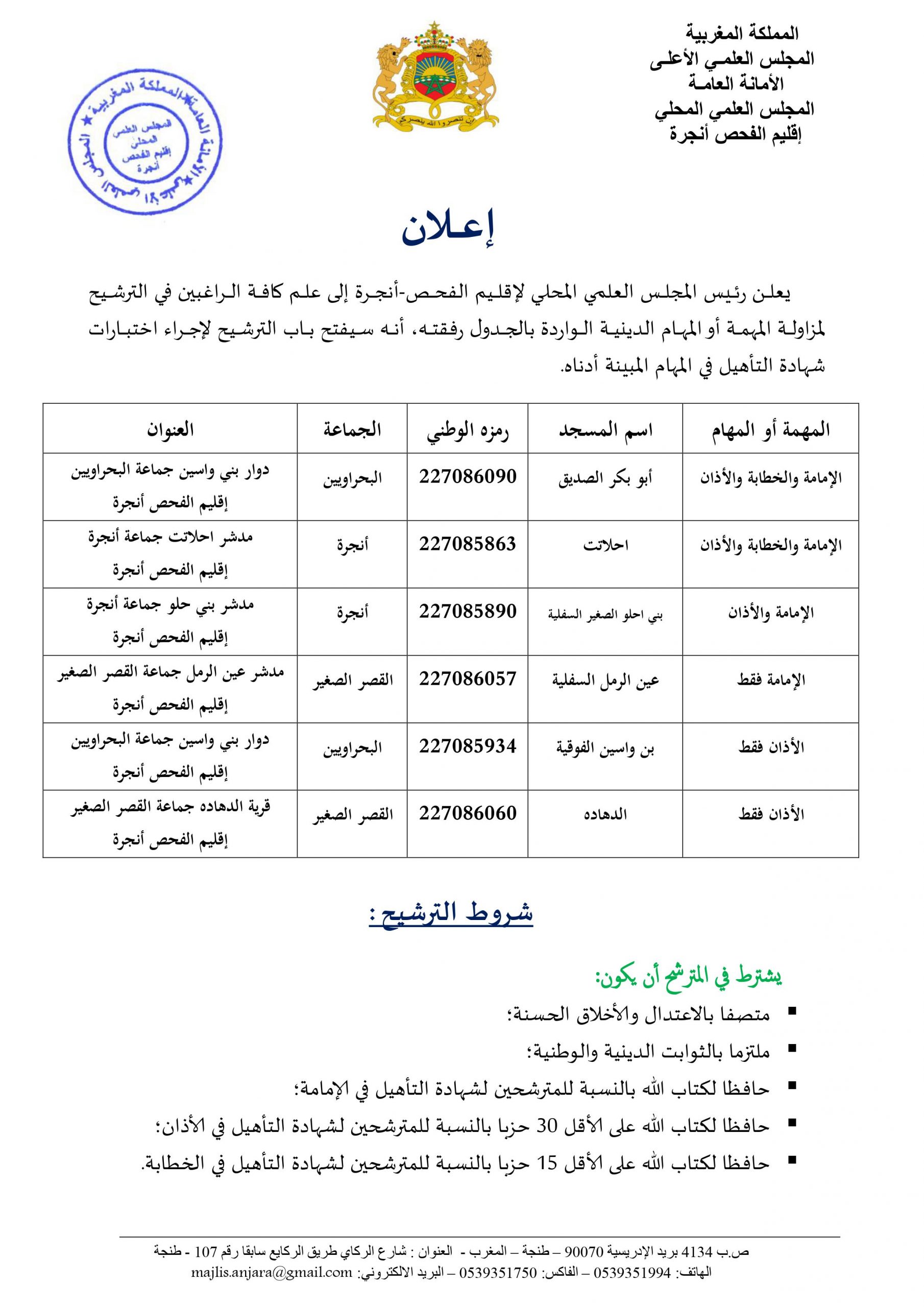 يعلن رئيس المجلس العلمي المحلي لإقليم الفحص-أنجرة إلى علم كافة الراغبين في الترشح لمزاولة المهمة أو المهام الدينية الواردة بالجدول رفقته، أنه سيفتح باب الترشح لإجراء اختبارات شهادة التأهيل في المهام المبينة أدناه: