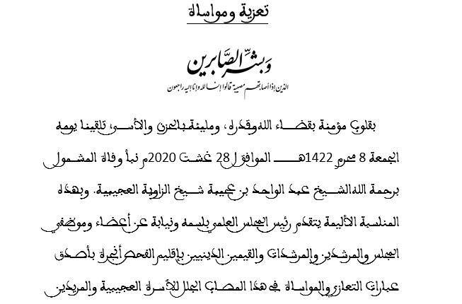 إعلانات المجلس تعزية ومواساة في أغسطس 29, 2020 شارك WhatsAppFacebookTwitterLinkedinTelegramالبريد الإلكتروني شارك WhatsAppFacebookTwitterLinkedinTelegramالبريد الإلكتروني