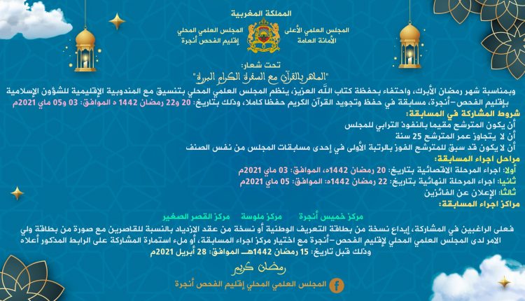 بمناسبة شهر رمضان الأبرك، واحتفاء بحفظة كتاب الله العزيز، ينظم المجلس العلمي المحلي بتنسيق مع المندوبية الإقليمية للشؤون الإسلامية بإقليم الفحص-أنجرة، مسابقة في حفظ وتجويد القرآن الكريم حفظا كاملا، وذلك بتاريخ: 20 و22 رمضان 1442 ه الموافق: 03 و05 ماي 2021م.