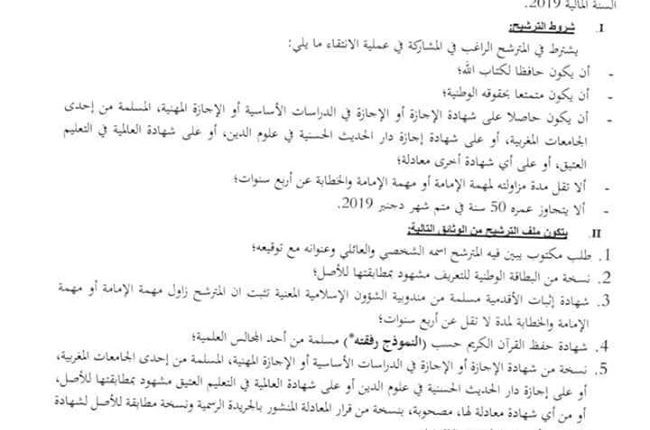 فتح باب الترشيح للتعاقد مع القيمين الدينين المكلفين المزاولين لمهمة الإمامة أو لمهمة الإمامة والخطابة برسم سنة 2019 عدد المناصب المتبارى عليها (24).